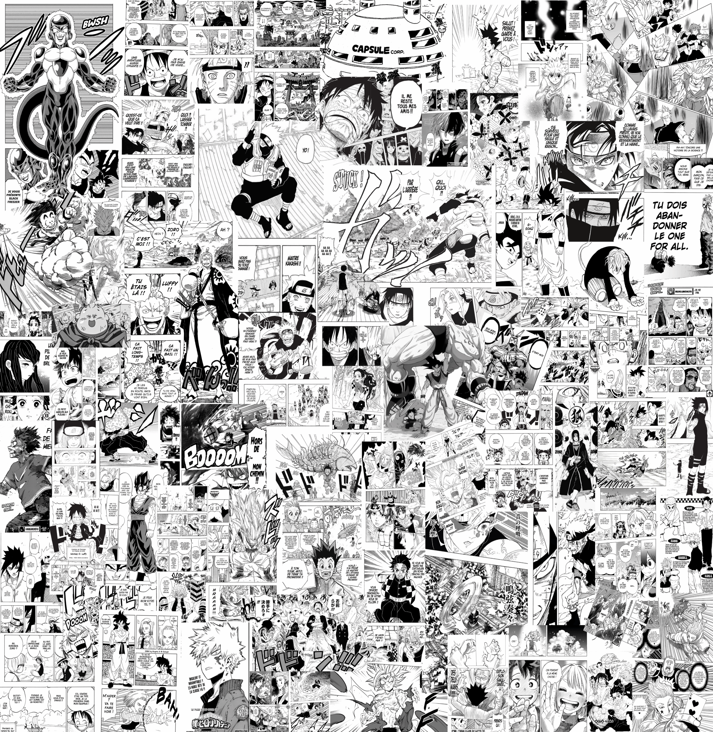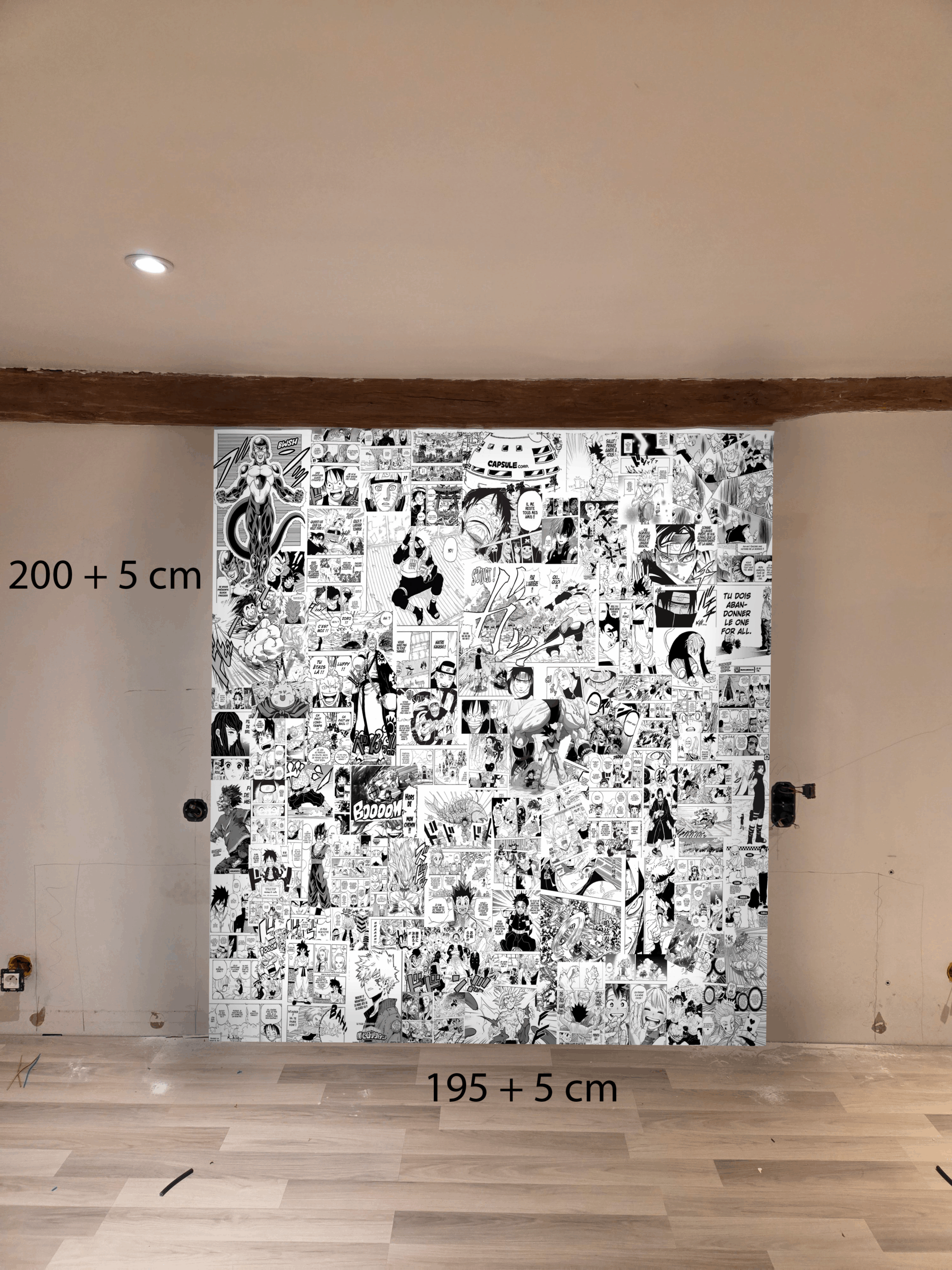 La fresque est composée d’un collage dense de planches et cases manga, imprimées en pigmentaire HD pour un rendu net, profond et durable. La marge de 5 cm sur chaque côté permet une pose parfaite, même en cas d’imperfection murale ou d’ajustement nécessaire.