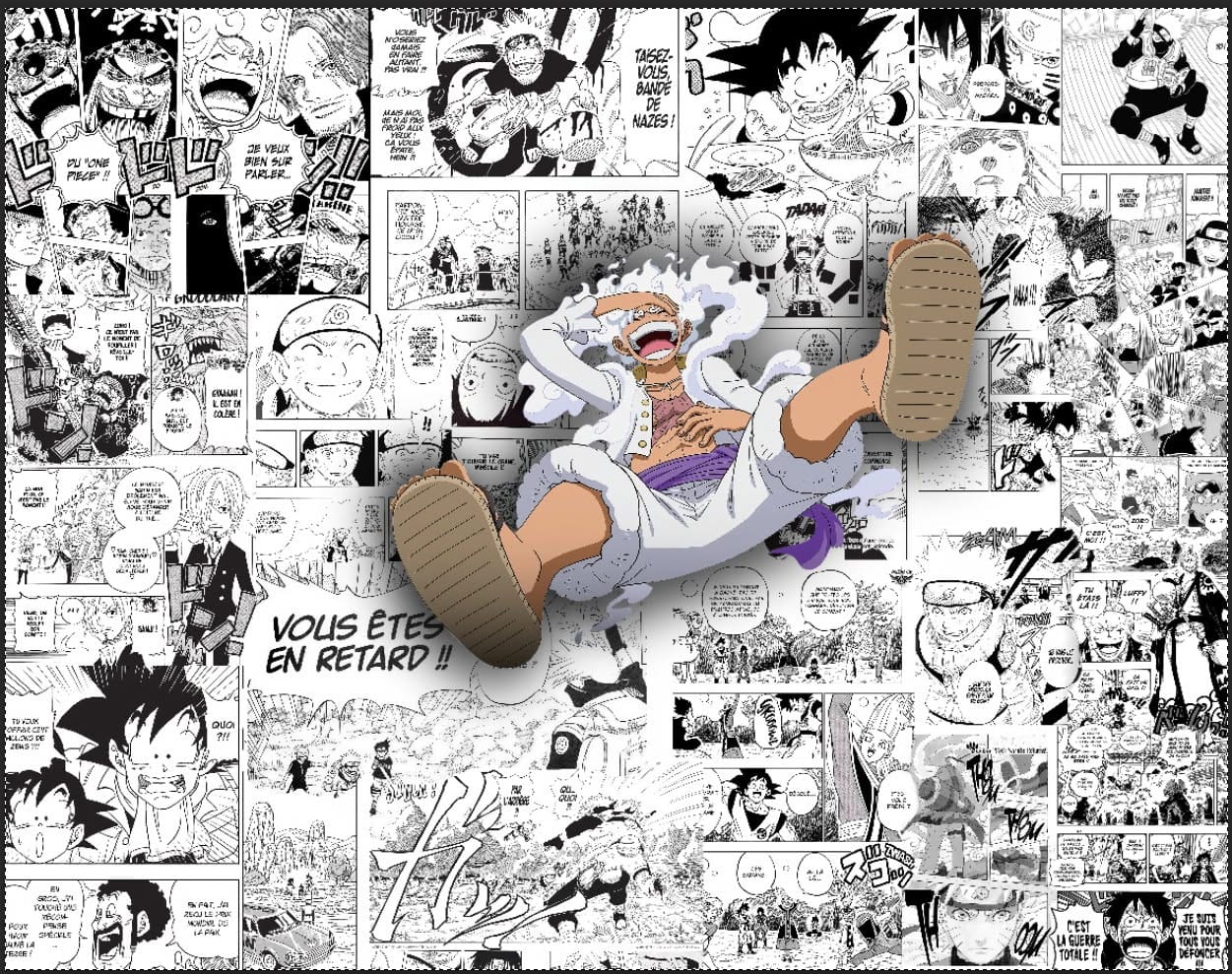 Le fond reprendra un collage de planches manga noir et blanc, tandis que le personnage principal (Luffy en Gear 5) sera intégré en couleur et en relief visuel pour un effet spectaculaire.