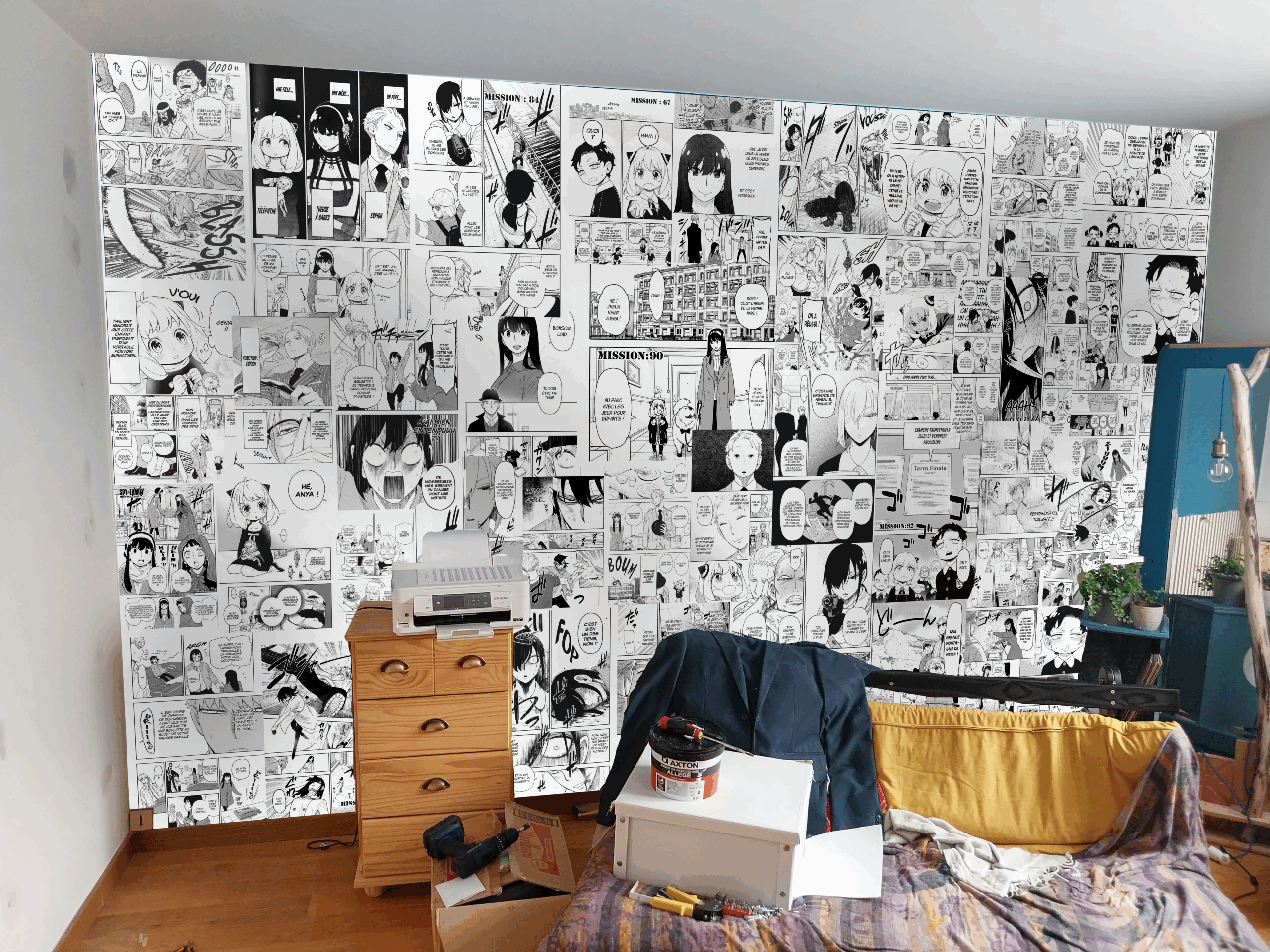Papier peint intissé Spy x Family – Impression HD 310 dpi, fabrication artisanale, pose facile panneau par panneau. Dimensions sur mesure : 4m x 2,5m (10 m²).